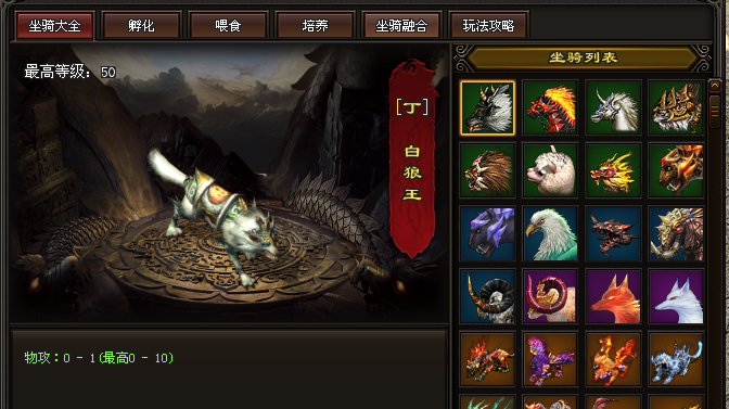 特色坐骑玩法,可通过坐骑蛋孵化获得,所有怪物均有几率爆出,可喂食,培养,融合。