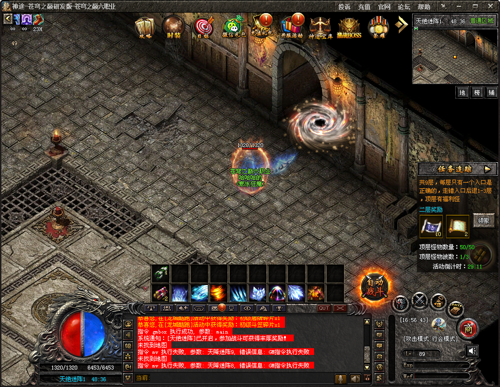 活动说明:活动一共9层,每层需杀怪达到一定积分才可进入下一层,每进入下一层都可获得个人奖励,前15名进入到第9层的玩家将获得排名奖励,第九层每1分钟向地图所有玩家发放一份宝箱,第10分钟,第20分钟分别刷新活动BOSS,越快到达九层,在九层待的时间越久,就杀boss,以及堵截其他玩家进入可提高活动奖励。