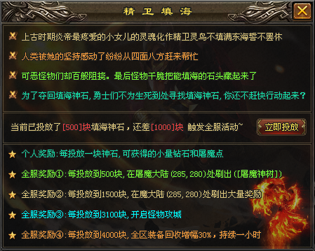活动说明:投放神石可获得钻石和屠魔点奖励,投放到指定数额即可开启全服奖励。