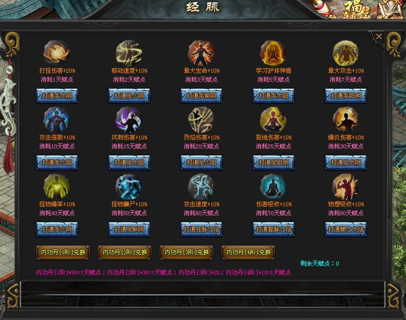 1)玄机老人:可使用内功丹兑换天赋点,使用天赋点可打通人物经脉,兑换天赋点所需的各级内功丹不同,每打通一种经脉,都将赋予人物角色一种强大的功能。